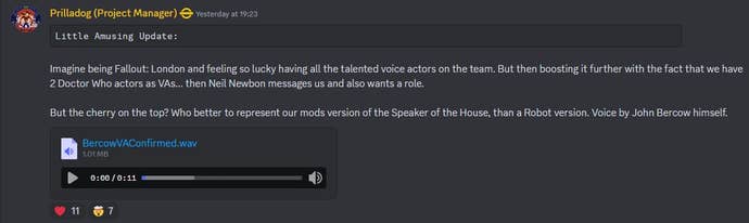 "Imagine being Fallout: London and feeling so lucky having all the talented voice actors on the team," he wrote, "But then boosting it further with the fact that we have [two] Doctor Who actors as VAs... then Neil Newbon messages us and also wants a role."