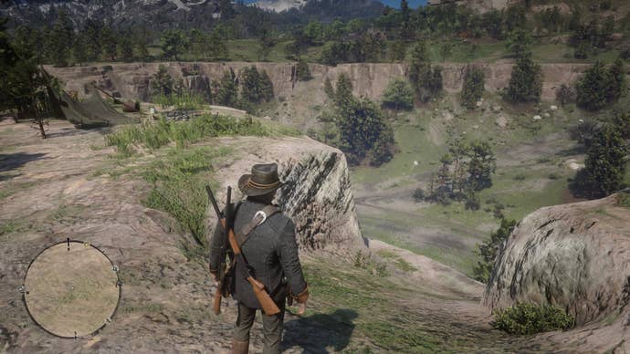 Next, you’re off to a location just south of Valentine, called Caliban’s Seat. Climb up all the way to the very top of the rock, leaving your horse behind, until you're facing an abandoned camp. Now look to your right, and you can find a path that slopes downwards.