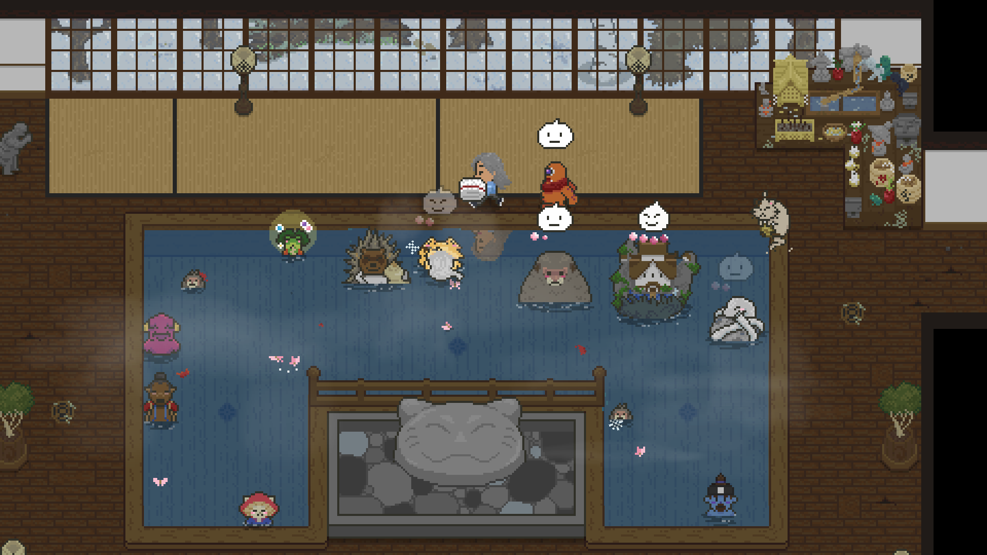 Managing the bathhouse and keeping its customers happy is far from all you’ll spend your time doing, though. When you’re not running around the bathhouse drying towels and keeping the water hot, you’ll be discovering new spirits as you adventure around this picturesque pixel-art town. Wherever trouble or mischief strikes, there’s another lost spirit to discover and invite into our bathhouse; and as Wonyan keeps reminding us, more customers means more money!