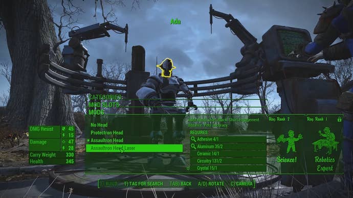 The best part of Automatron, though, is that you can build up your own robot arsenal. I turned both Ada and Cogsworth into killbots worthy of Armored Core, each loaded with missiles, miniguns, and gatling lasers. True, creating a true killbot makes most of Fallout 4's combat trivial, but it's worth it just to walk into a room with what amounts to The Terminator at your back.